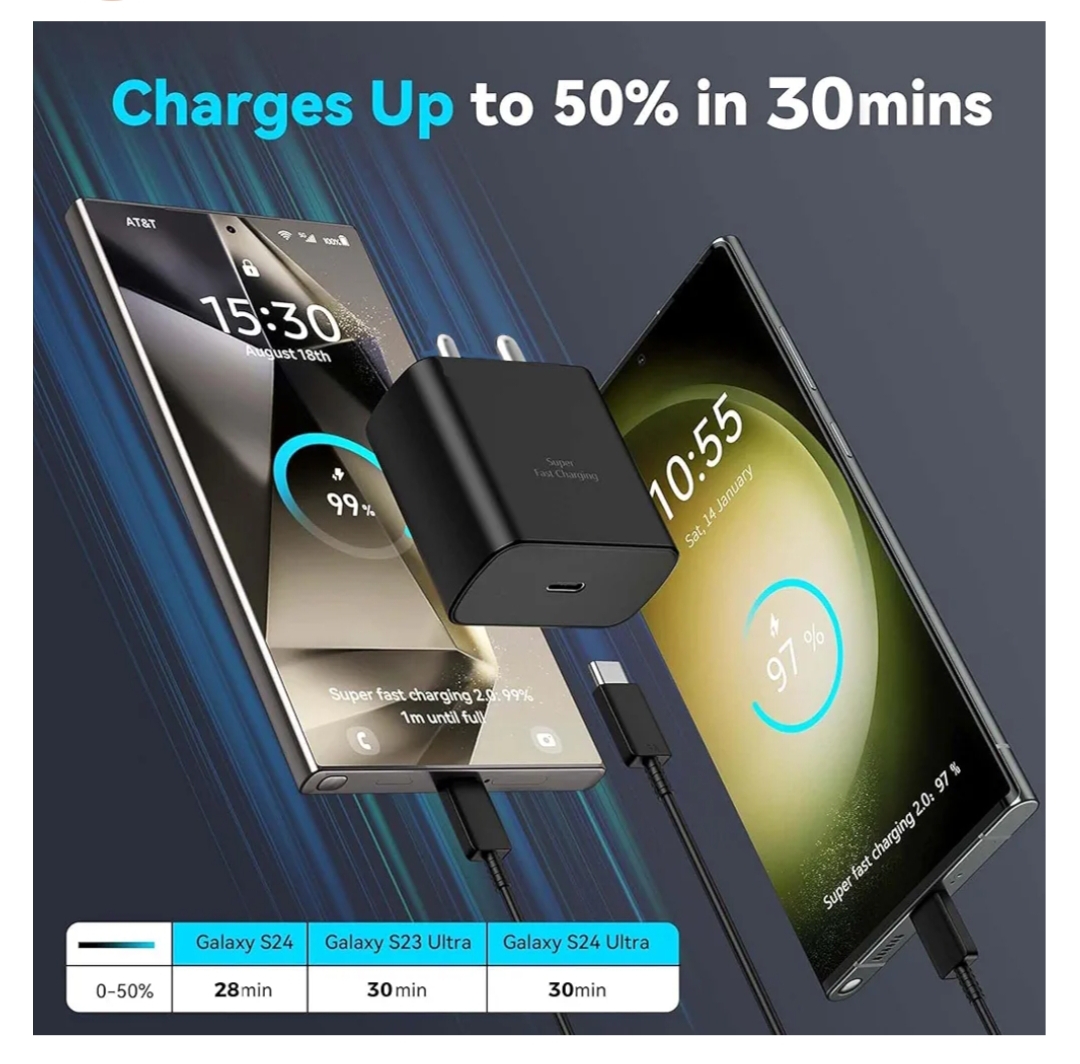 • [ 45W Super Fast Charging ] : Type c charger with PD 3.0 technology ensures highly efficient charging, powering up your Galaxy S24 or S23 Ultra from 0% to 50% in just 30 minutes, significantly faster than standard 20W chargers